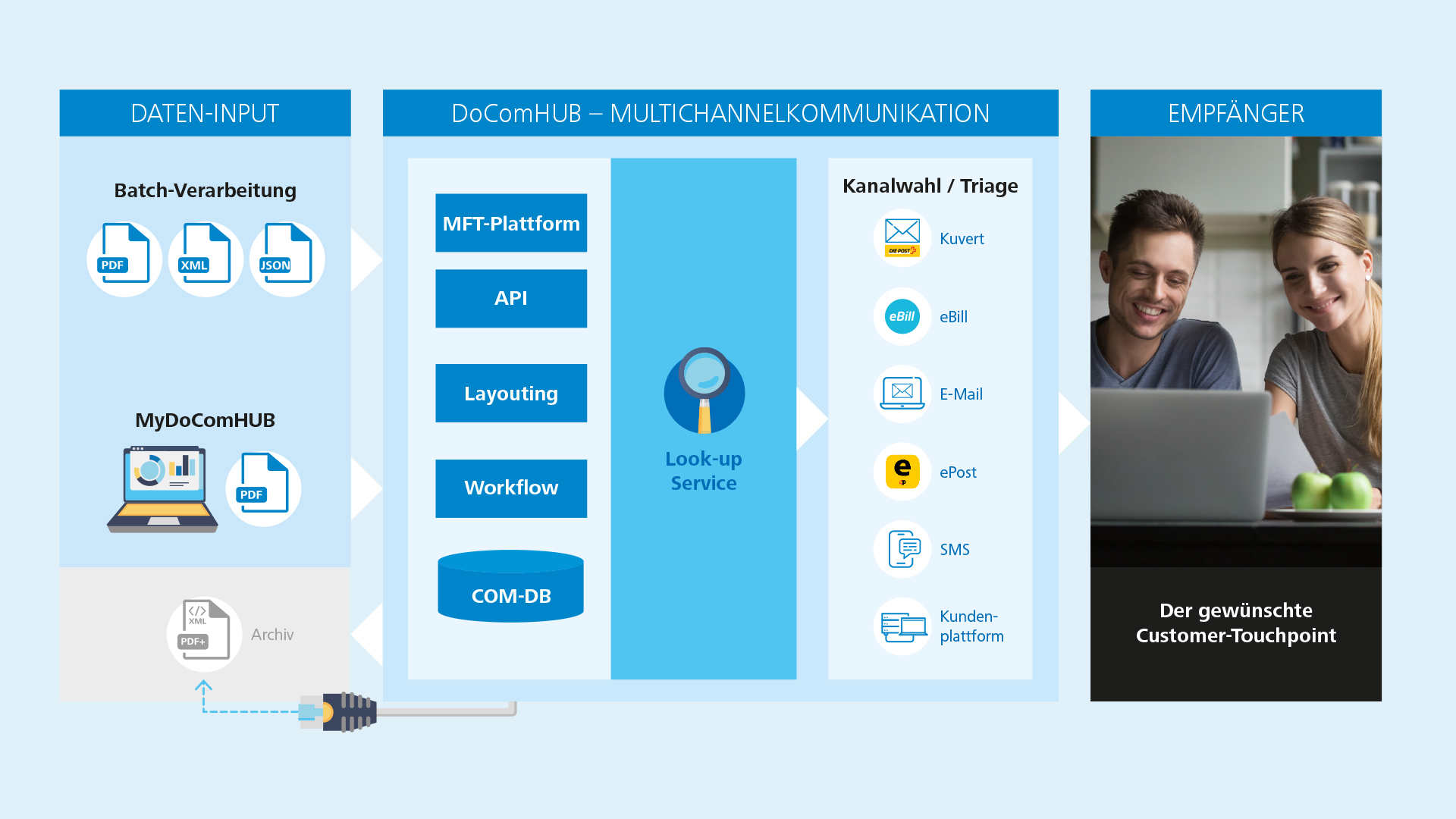 Damit der Empfänger Ihrer Dokumente, diese dort erhält, wo er am besten erreichbar ist, verfügt unser System über eine sogenannte Lookup-Funktion, welche uns eine Abfrage der Empfangsoptionen ermöglicht und entsprechend die Zulieferung auf dem präferierten Kanal.