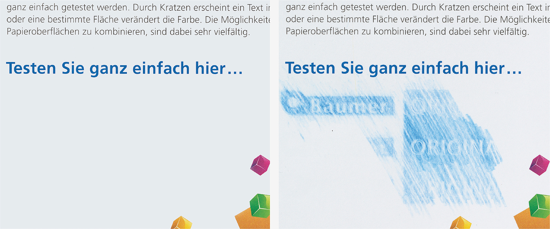 Gummierte Felder, die mit einer Münze oder ähnlichem abgerubbelt werden müssen, um einen Code oder ähnliches freizulegen, sind altbekannt. Die ScratchInk-Technik von Baumer geht den umgekehrten Weg und sorgt so für eine Extra-Überraschung: Dort, wo augenscheinlich zunächst überhaupt nichts Besonderes zu erkennen ist, entsteht bei Reibung wie von Zauberhand ein Motiv.