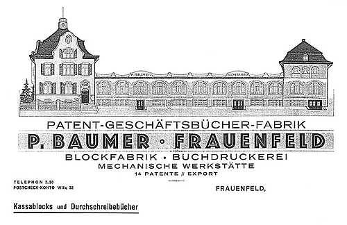 Die Geschäfte laufen und die Räumlichkeiten werden bald zu eng. An der Laubgasse in Frauenfeld wird ein imposanter Neubau gebaut. Im gleichen Jahr lässt die Baumer AG ein Patent für Geschäftsbücher mit Rohlederrücken eintragen.